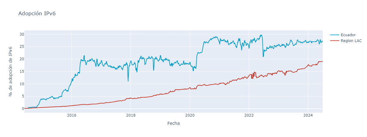 Finalmente quiero dejar una imagen con el reporte de adopción de IPv6 del Ecuador frente a la región de Latinoamérica y El Caribe, donde podemos observar que en los último dos años el crecimiento ha sido mínimo y debemos enfocar los esfuerzos en impulsar la adopción a IPv6 en nuestras organizaciones con mecanismos de transición probados y buenas prácticas, que no sugieran un riesgo para las organizaciones.