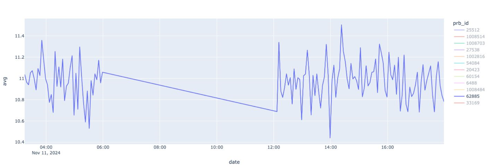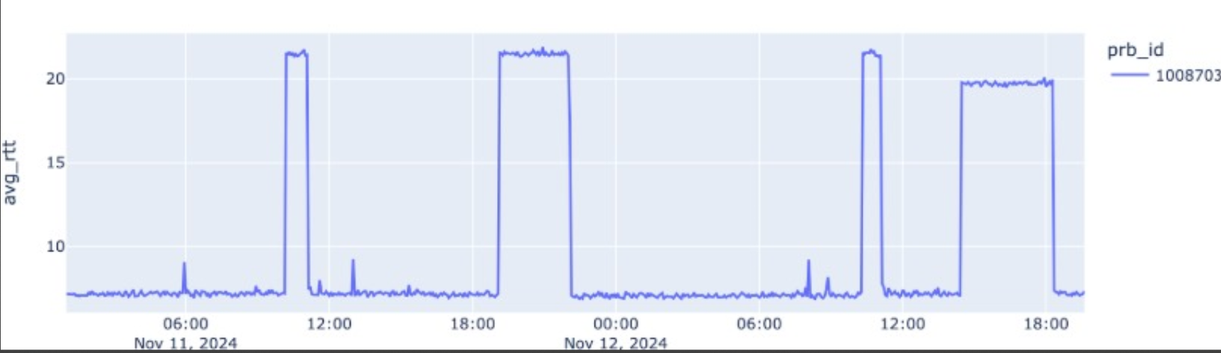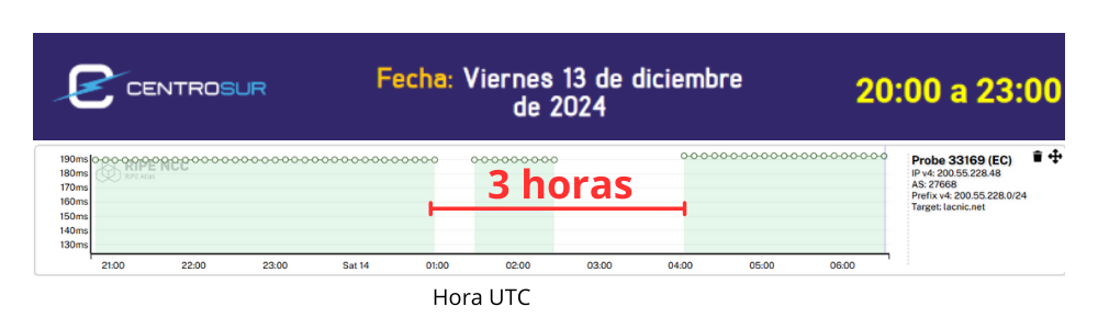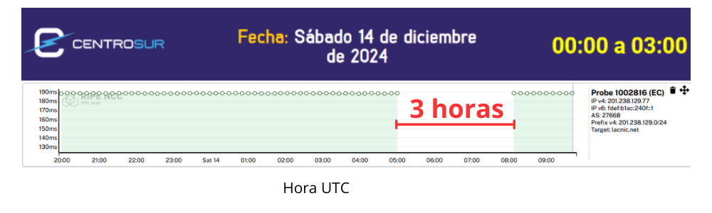 Para medir el impacto de los cortes de energía, se tomaron datos de latencia hacia el servidor DNS raíz mediante el indicador RTT (Round Trip Time), para lo cual se considera la sonda 1008703 / ASN 2700009 (SARAGUROSNET) en la provincia de Loja, al sur del Ecuador, esta sonda no ha sudo afectada por los cortes de energía y permite observar que entre el 11 y 13 de noviembre de 2024, existen picos de latencia entre las 05h00 - 06h00 y entre las 14h00 y las 17h00 de Ecuador.