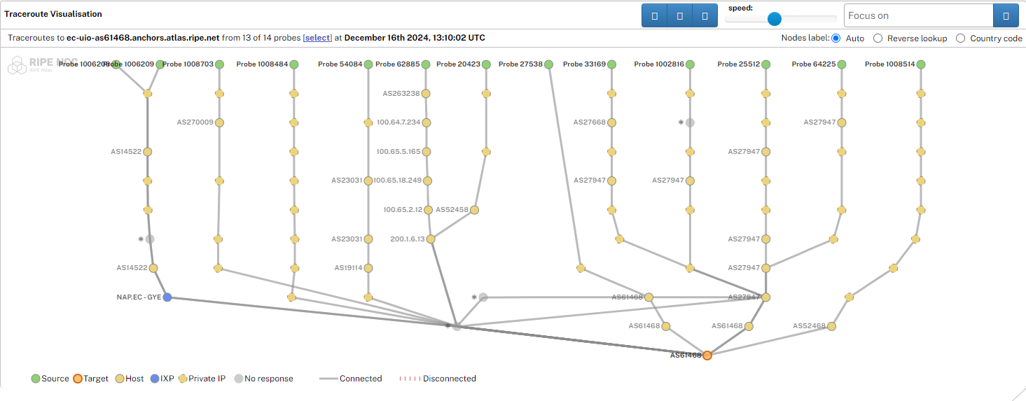 Utilizando RIPE Atlas, se realizó una medición desde las sondas disponibles en el Ecuador hasta el Anchor de CEDIA, donde se pudo observar que todas las sondas pueden alcanzar al anchor, inclusive se confirma que se encuentra en funcionamiento el IXP (punto de interconexión) NAP.EC - GYE, garantizando que es posible encontrar un camino a cualquier destino dentro de Internet.